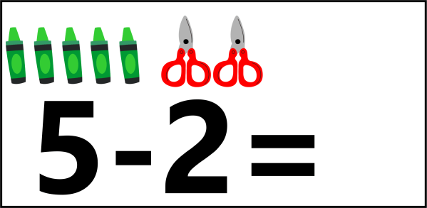 Observa la siguiente tarjeta, hay una representación de una resta como 2 conjuntos diferenciados, para los niños pequeños que están aprendiendo a restar esto no tiene sentido, estas presentando dos conjunto uno de 5 y otro de 2 y colocas un signo de menos (que en un primer momento no significa nada para el estudiante) y no estás generando la acción de quitar.