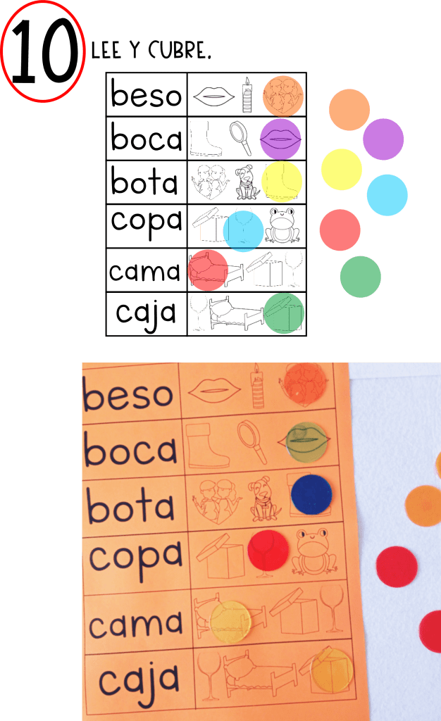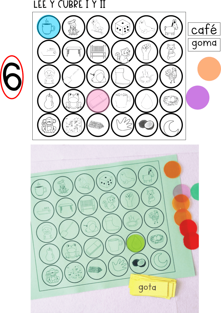 6️⃣Otra idea es hacer un tablero con palabras, las palabras en tarjetas y usando fichas traslucidas se puede trabajar a leer y cubrir, la tarea consiste en leer y cubrir todas las palabras.