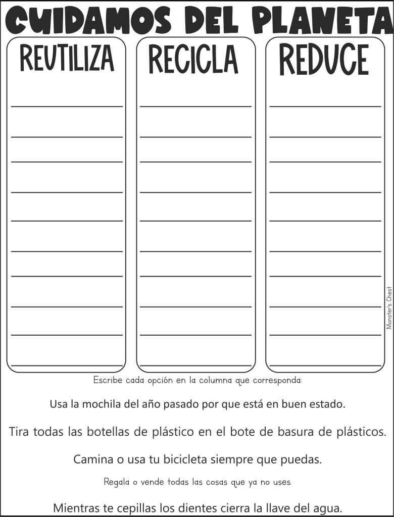 - Enseña acerca de las tres R’s, Reciclar, Reutilizar y Reducir. Enseña intencionalmente a tus estudiantes acerca de formas sencillas de cuidar el planeta.