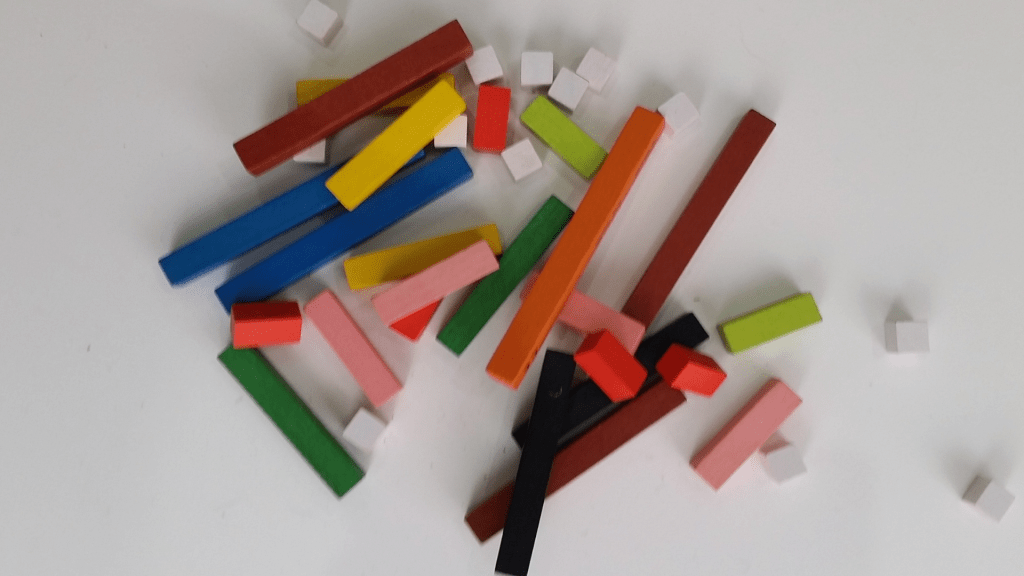 - Exploración de patrones y secuencias: Anima a los estudiantes a crear patrones y secuencias utilizando regletas de Cuisenaire. Pídeles que elijan un conjunto de colores y organicen las regletas en un patrón, por ejemplo, rojo, azul, amarillo, rojo, azul, amarillo, y así sucesivamente. Luego, invítalos a compartir sus patrones con el resto de la clase. Esta actividad ayuda a desarrollar habilidades de pensamiento lógico y reconocimiento de patrones.