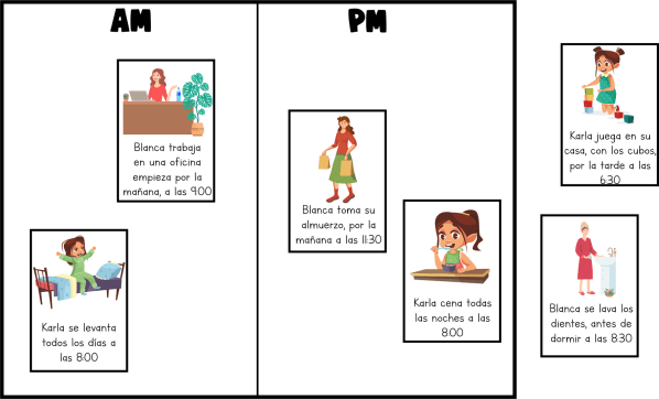 1.- Posters explicativos. Empieza explicando las particularidades del reloj, para que sirve, los tipos de relojes que hay, conceptos básicos como la duración de un día de 24 horas y la duración de las horas de 60 minutos. Explica la diferencia entre reloj analógico y digital y los conceptos AM (Antes del mediodía) y PM (Después del mediodía).