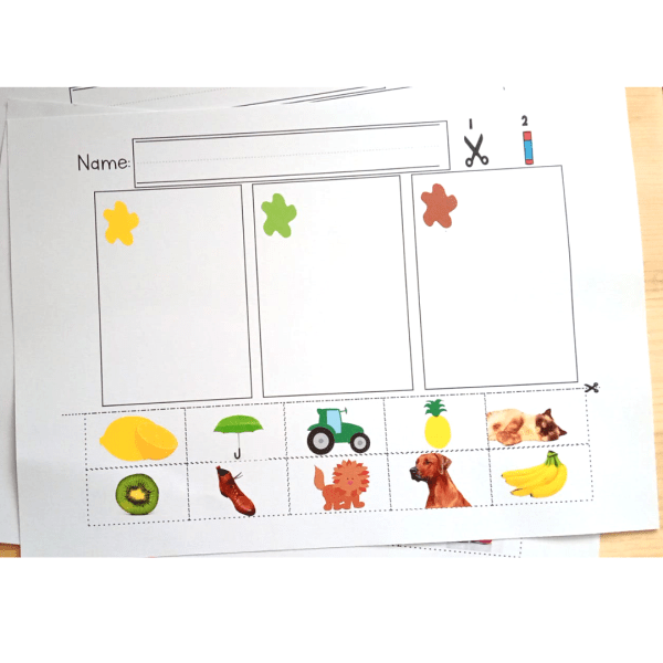 Las hojas de trabajo incluyen imágenes para recortar y pegar en el lugar correcto.